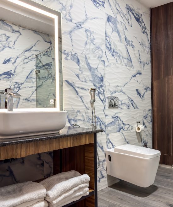 The luxurious en-suite bathroom boasts a walk-in shower, sleek marble vanity, and premium bath amenities, offering guests a spa-like experience in their own private retreat.